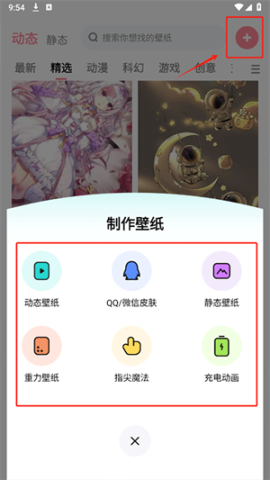 1. 点击首页右上角的“+”号,从中选择制作静态壁纸或动态壁纸的选项。