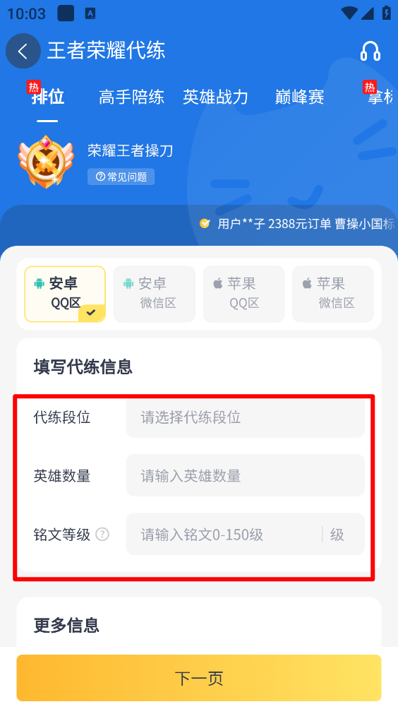 3、进入后选择区号,填写代练信息,点击"下一页"。