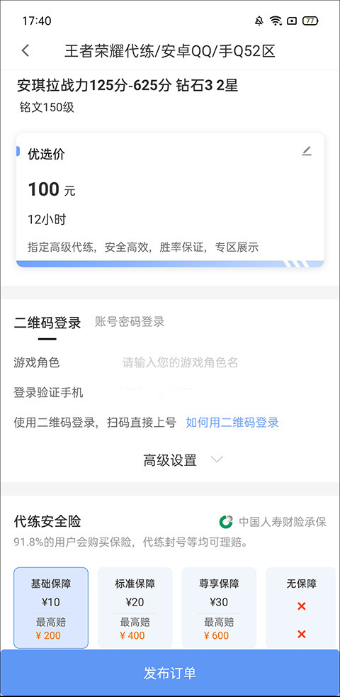 2、随后点击首页右上角的“+”号来发布订单,可自行输入代练类型、游戏区服、铭文等级、英雄数量、当前段位、目标段位等信息。
