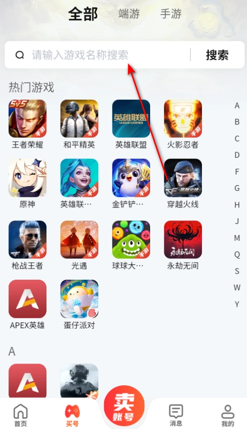 1. 打开蜜袋游账号交易软件,点击软件上方的搜索按钮。