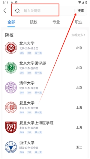 1、在搜索框中输入关键词来查询院校、专业等信息