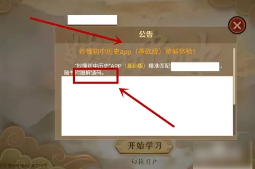 1. 开启妙懂历史App,进入到公告页面,按照公告所给提示获取解锁码。