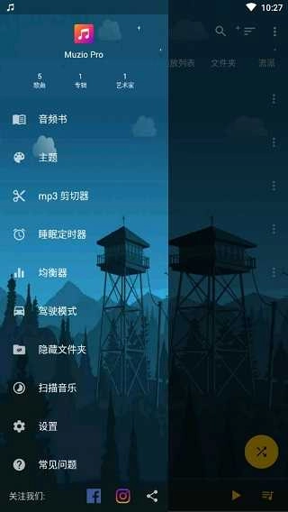 点击左上角的菜单按钮,可以访问更多高级功能,例如音频书、主题切换、Mp3剪切器、睡眠定时器、均衡器设置、驾驶模式、隐藏文件夹、音乐扫描和基础设置等。