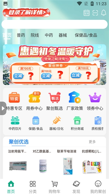 不仅如此,聚创医药网软件还提供一对一的诊疗服务,矢志打造一个采购商无界限、多触点对接的权威医药联盟。1. 打开软件,来到首页,依据自身采购需求,进入对应的专区。