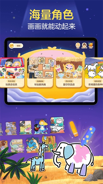 绘画主题每月更新,主题内角色阶梯式难度递增,不定期为孩子开放铅笔、水彩、油画、蜡笔、墨水笔、马克笔、织物等12种丰富多样的绘画工具,助力孩子自由创作,无限想象;