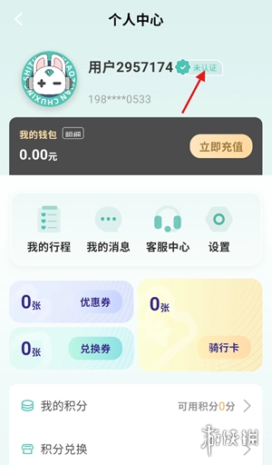 2. 在个人中心页面,留意用户名右侧标有“未认证”的提示按钮,点击此按钮即可进入身份验证流程。