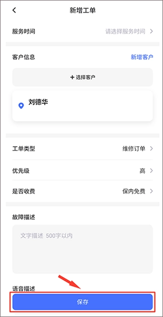 3、根据页面信息提示输入工单详情,填写完成后点击底部保存按钮即可完成下单。