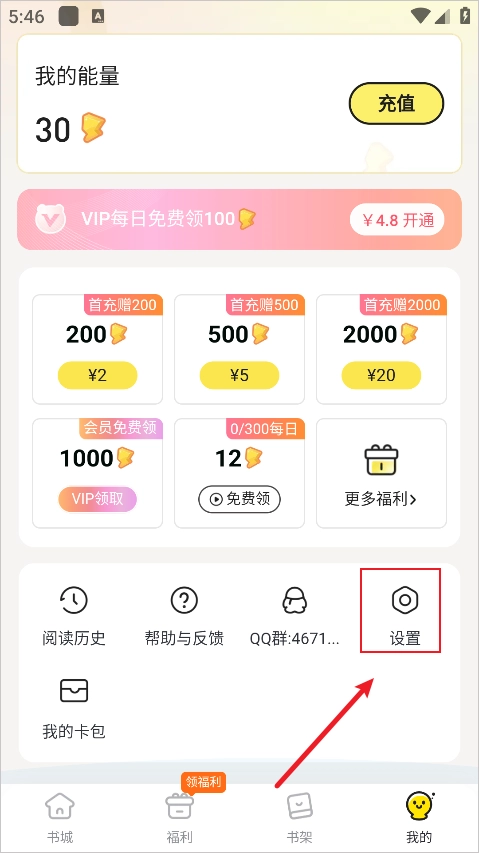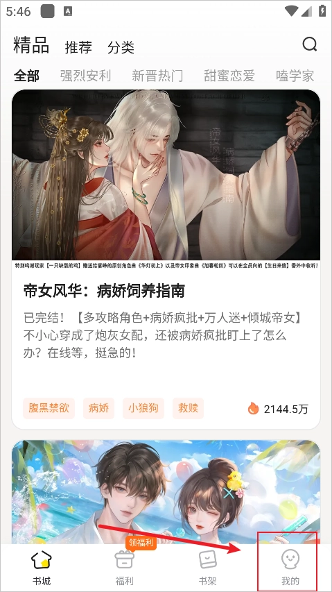 1、进入到首页中后可以切换到福利、书架、我的页面,点击右下角的【我的】