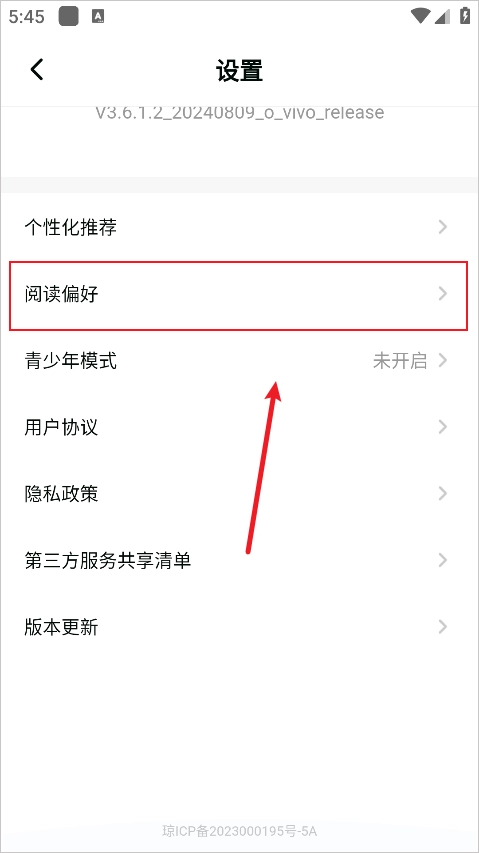 3、进入设置页面后,点击阅读偏好选项。