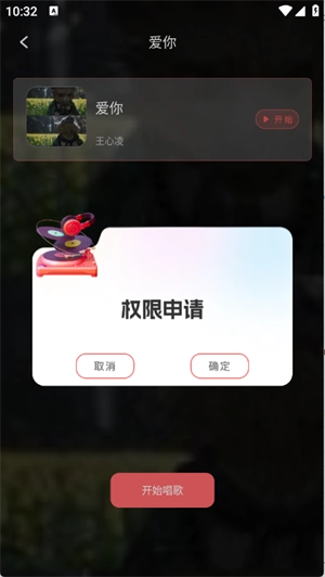 3、选择想唱的歌曲点击右侧的k歌,点击确定权限申请