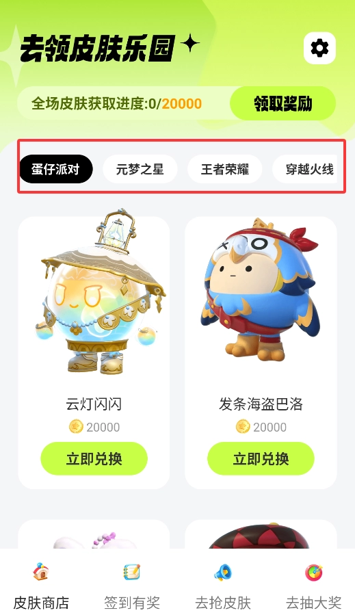 2、皮肤商城按热门游戏分类展示,包含蛋仔派对、王者荣耀等主流游戏道具。