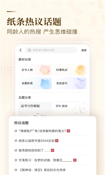纸条每天0点更新海量内容,涵盖好词好句、经典人物、央媒模板、高分写作技法以及中高考范文等,还依据中高考常考的20多个主题进行精细分类,搜索便捷,资源丰富到用不完!