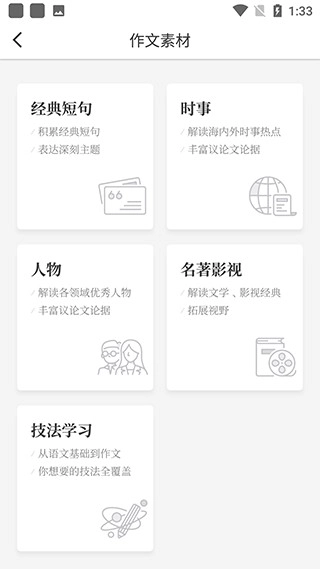 2、点击作文素材选项,里面涵盖了各种类型的作文范本可供参考阅读。