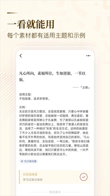 软件中提供了多种多样的写作素材可以使用与阅读,给你一站式的写作辅助体验