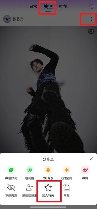 1、在首页的 “关注” 标签页,点帖子的右上角的 “三个点” 图标,然后点 “加入特关”。