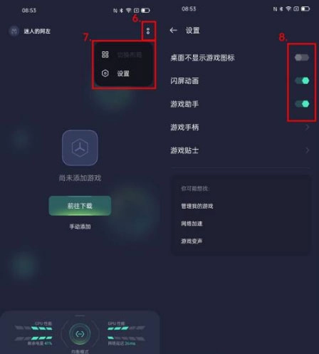 4、点击右上方“:”,还支持在桌面隐藏游戏图标、打开游戏助手,改变游戏空间布局等个性化设置。