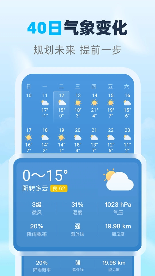 4、除了提供当日及未来数日的天气预报外,还能预测未来40天的气候趋势,助力用户更合理地规划。