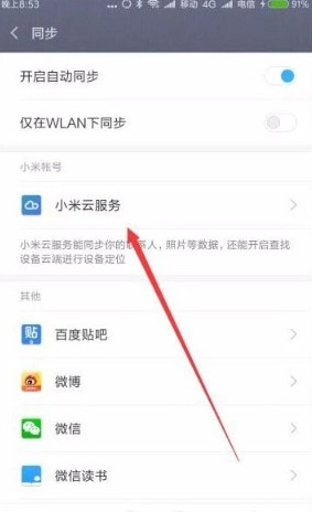 3、此时同步设置页面会被打开,在该页面中点击“小米云服务”这一菜单项。