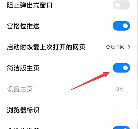4、接着找到简洁版主页,开启右侧的按钮,重启浏览器后,就能看到页面已以简洁版形式展示了。