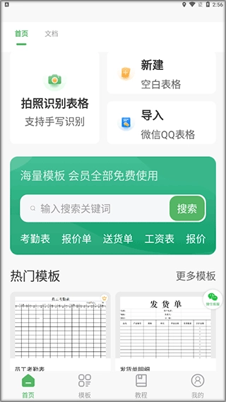 1、打开后,进入首页即可通过拍照识别创建表格,也能使用热门模板。