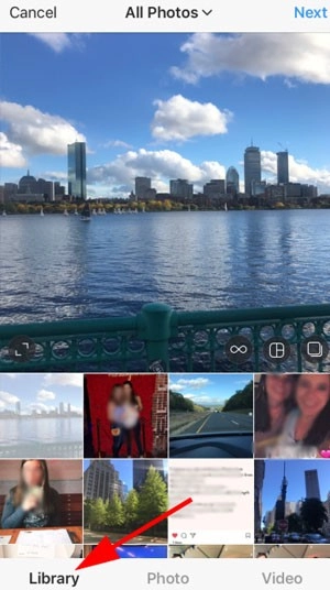 2.在这里,我们有三种选择——可以在手机上查看照片库,也可以在Instagram中直接拍摄新照片,也可以拍摄新视频。如果想要发布本地图片的话,可以浏览照片库,找到想要进行发布分享的照片。在完成图片的选择之后,点击右上角的“下一步”按钮。