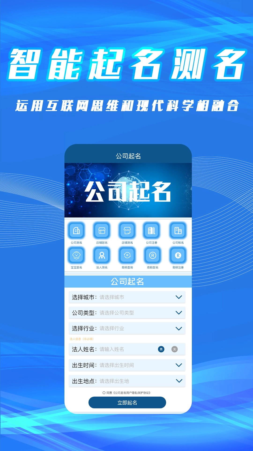 【公司起名数字新时代】 拥有全国千万公司名称库,通过填写公司取名基本条件,就能一键自动生成100-300个财运鸿通的公司名字,店铺名字。再也不怕公司起名重名,再也不用辛苦查阅字典起好了名字,再也不用担心提交审核单位却被一句“不合规”驳回。