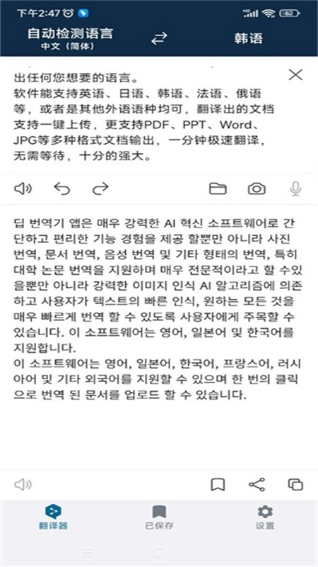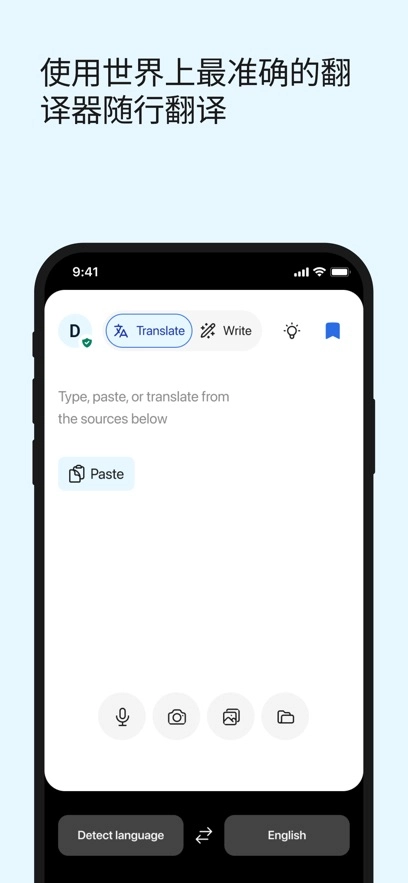 deepl作为专业的手机翻译器,可以实时为用户翻译各个国家及地区的语言,帮助用户能够与当地人正常进行交流沟通,软件中支持多种方式进行翻译,不管是拍照还是文字、语音都可以直接获得对应的中文翻译内容,软件中还将会为用户提供AI智能翻译,只需拥有网络即可获得对应的翻译内容,内容精确,能够让用户学习到更多常用单词与词组。