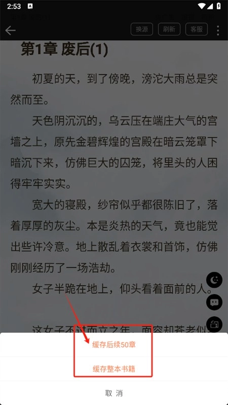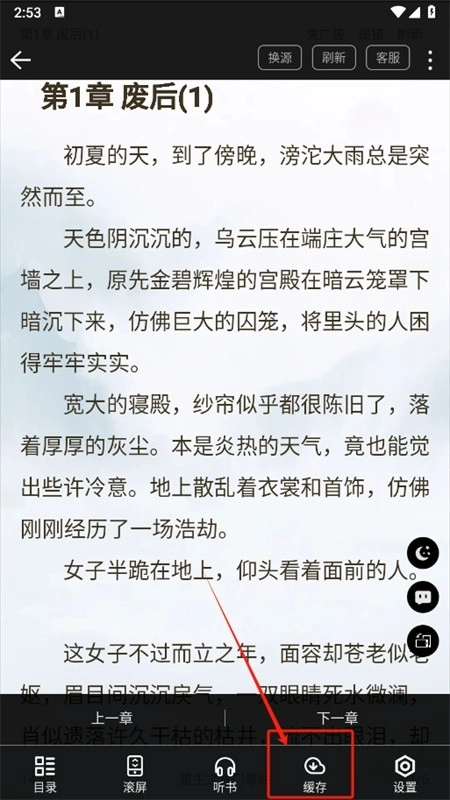 3、进入阅读界面后点击下方的缓存