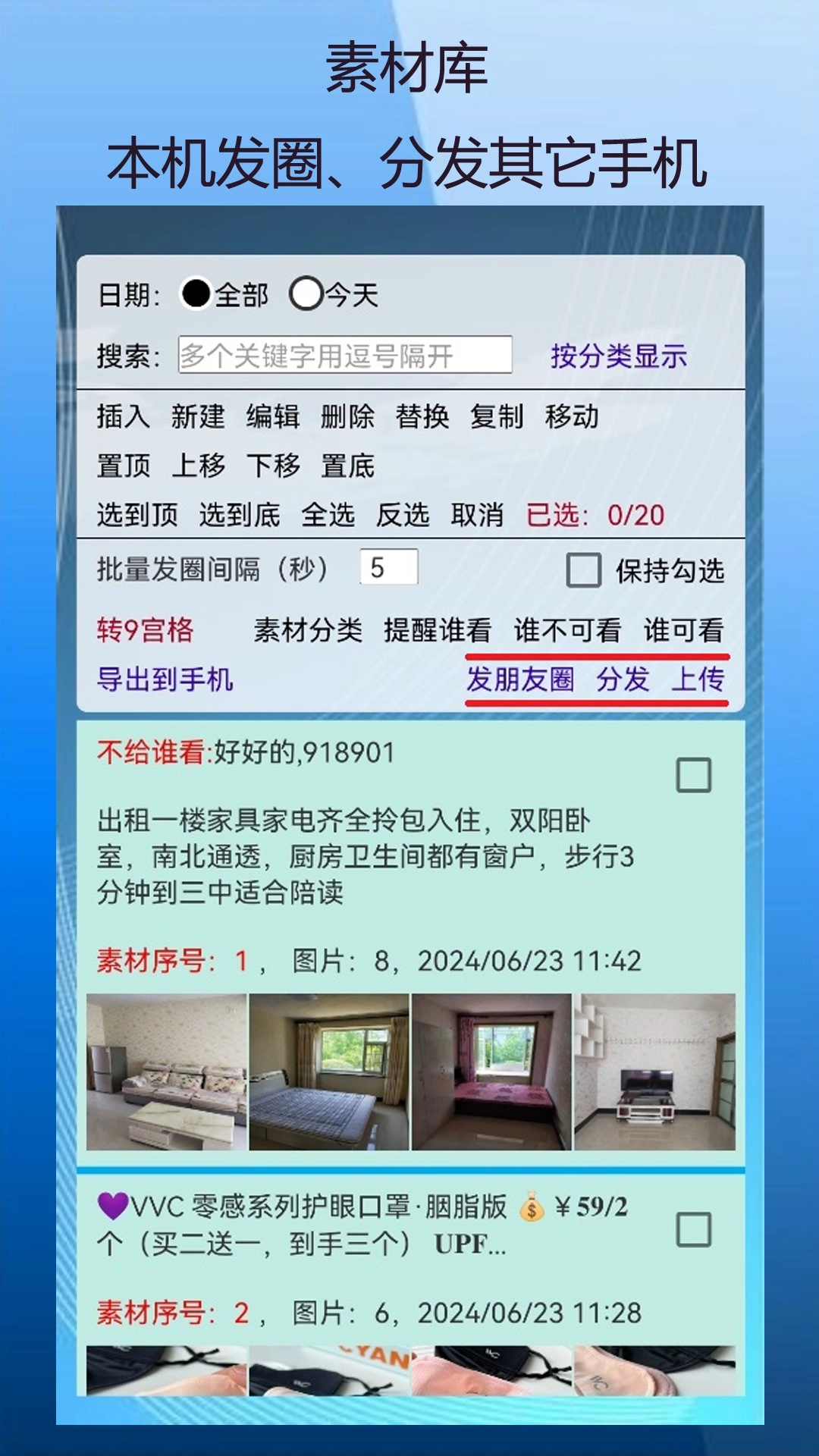 的素材库允许用户创建、编辑并保存各种类型的发圈素材,包括文字、图片、视频等。通过简单的操作,就能将精心准备的内容一键发布到朋友圈,大大提高发圈效率。