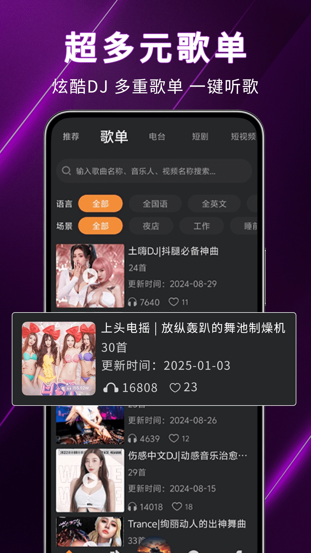 这里汇聚了超多类型的音乐,你想听的几乎都能找到!DJ舞曲、热门电音、咚鼓串烧、车载音乐、慢摇串烧、夜店酒吧包房串烧、的高串烧、纯轻音乐、抖音热门歌曲、网络热歌、网络红歌……各种风格一应俱全。