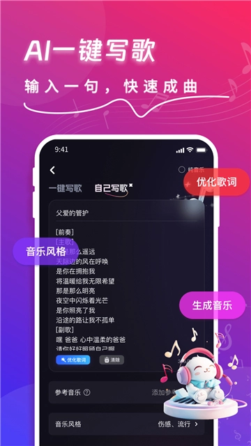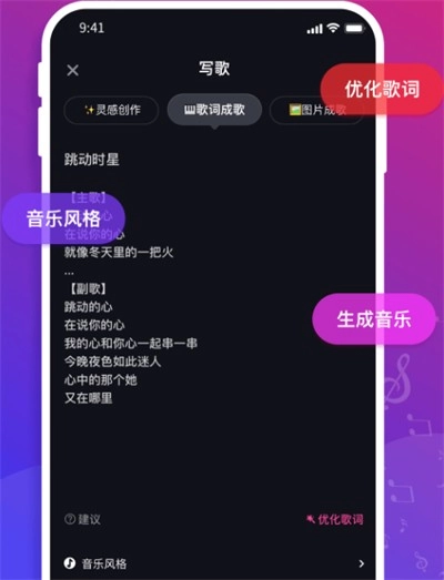 快歌作为一款超实用的音乐创作工具,搭载全新AI技术,能助你在线轻松完成歌曲创作,无论哪种风格都能驾驭,全方位满足你的多样需求。只需输入一句话,就能快速生成音乐,还能对歌词进行优化,为你激发创作灵感。创作完成后,支持在线试听,让你能便捷地进行修改调整。