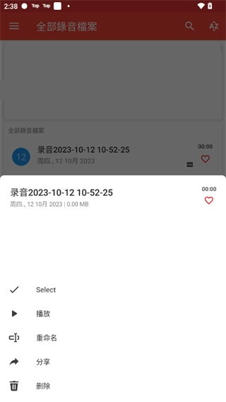 4、保存好的录音会直接显示在首页,长按对应的录音条目,就能对该录音文件进行播放、重命名和删除等操作