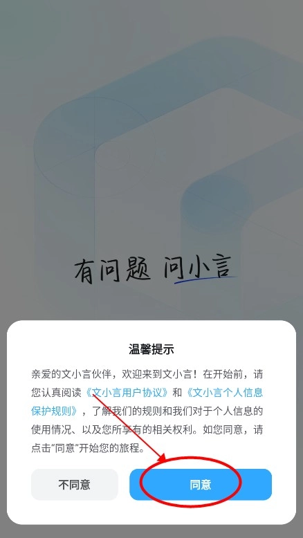 首次安装本应用的用户,在进入应用时会弹出温馨提示弹窗,阅读提示内容后点击“同意”按钮即可。