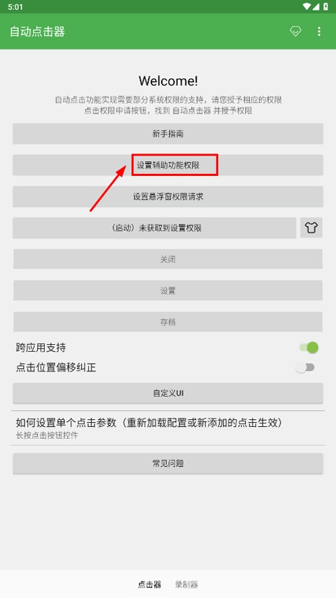 1、打开自动连点器,点击设置辅助功能权限选项。