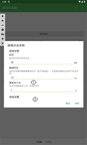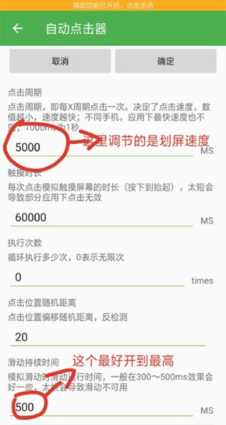 10、可设置点击属性,能指定点击的间隔频率,时长建议调至最大,执行次数务必设为0,否则无法实现持续自动运行。