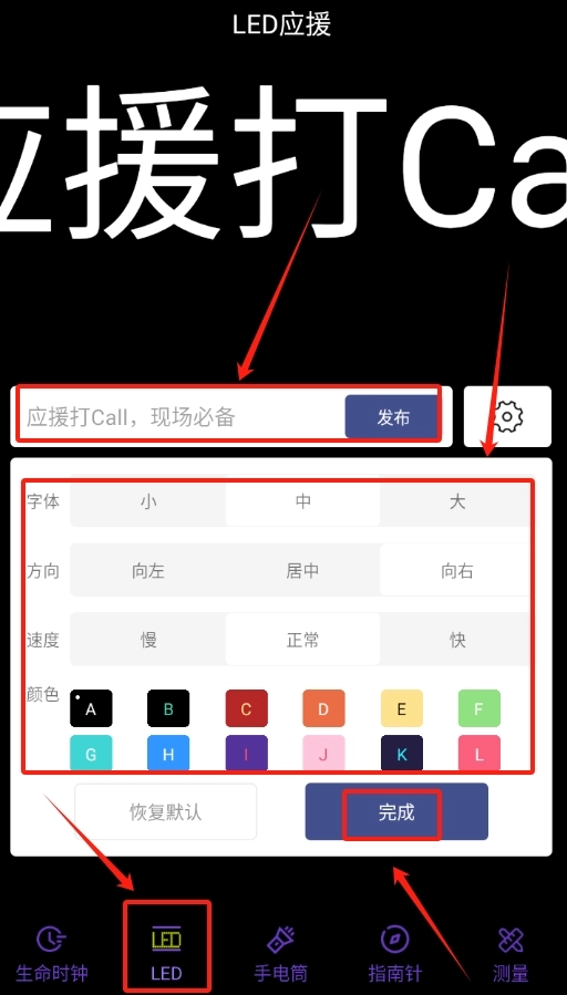 2、软件里还能设置 LED 应援灯,你可以自己选择内容的字体和喜欢的颜色。