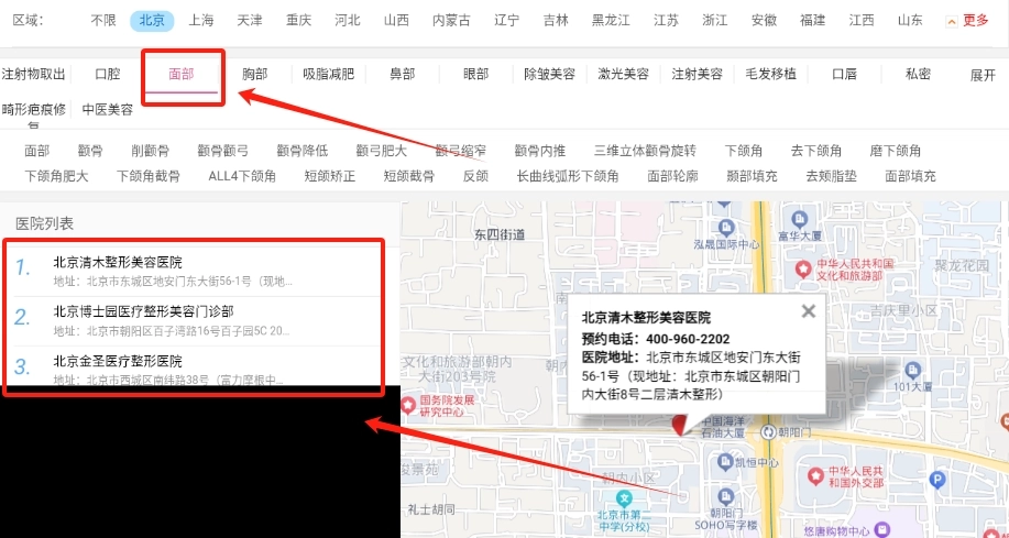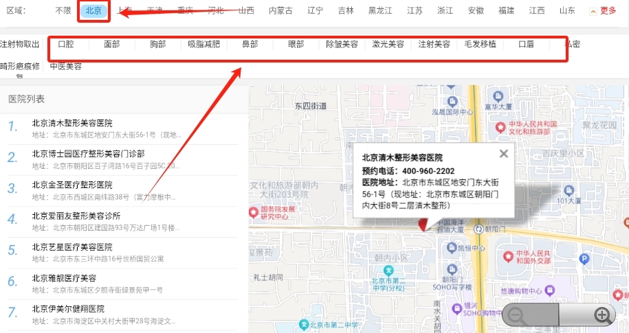 2、选好想做的项目部位,系统会推荐这方面最专业的几家医院给你参考。