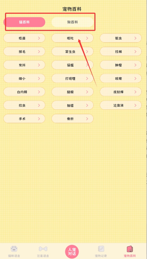 3、进入宠物百科,即可记录狗狗的生活事实,更好关注宠物健康。