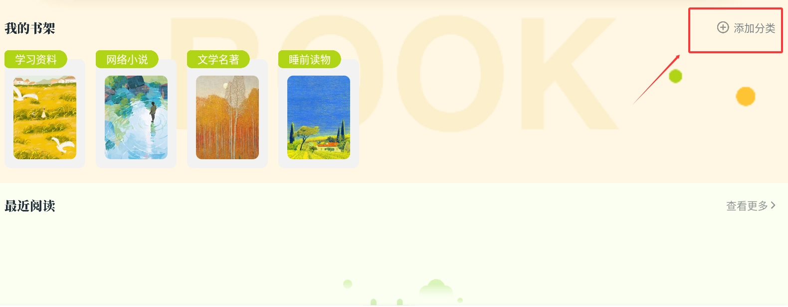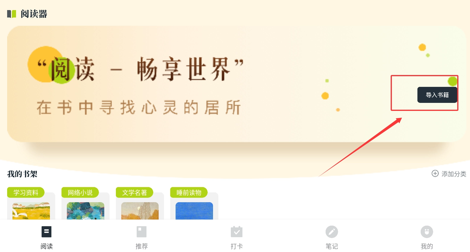 1、进入首页后,可将文件夹里的书籍添加进去,按照提示点击操作就行。
