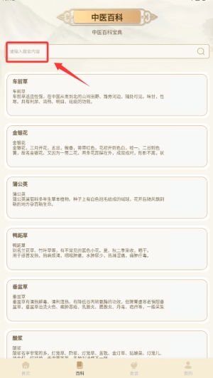 2、在搜索框中输入药材名称或功效关键词,即可查找相关内容。