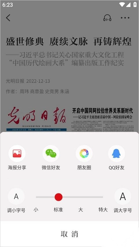 3、放大后,点击右上角“…”可调节字号大小,方便阅读,支持一键分享至微信、微博等社交平台,底部也有分享按钮。