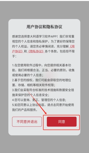 1、点击同意按钮以顺利进入应用界面,开始你的意大利语学习之旅,确保一切功能正常运行。