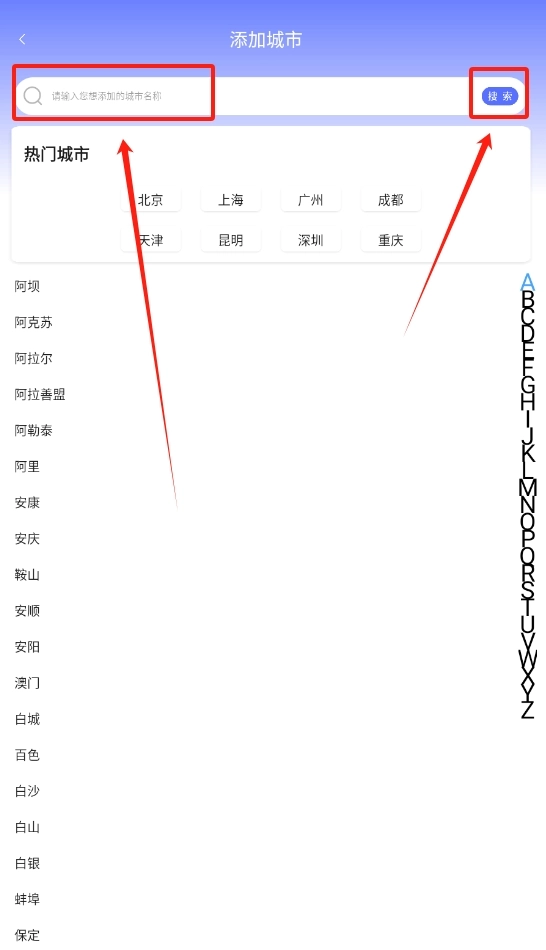 2、在搜索框中输入城市名称,输入完成后点击确定,该城市的天气信息就会添加到你的列表中。
