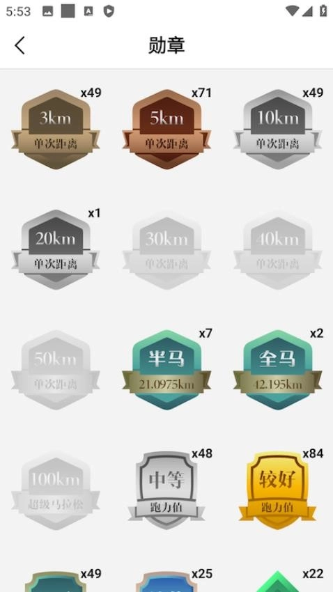 3、成就系统会设置阶段性的运动目标,当用户完成相应挑战后,就能获得虚拟勋章作为奖励。