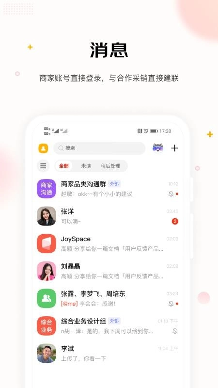 1. 消息管理:支持多种类型消息的接收与发送,能对全部、未读、稍后处理这几种状态进行区分,呈现效果清晰又直观。