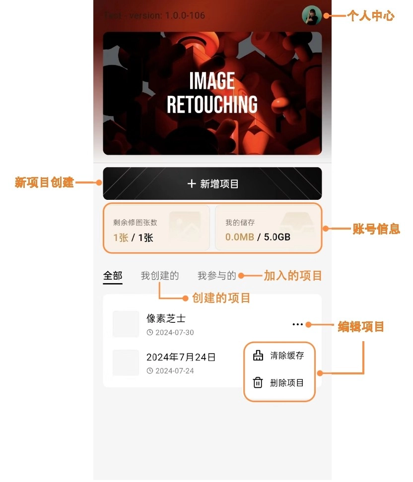 在这里您能够创建新的项目,同时可以对项目进行管理,还能查看当前账户的相关信息。