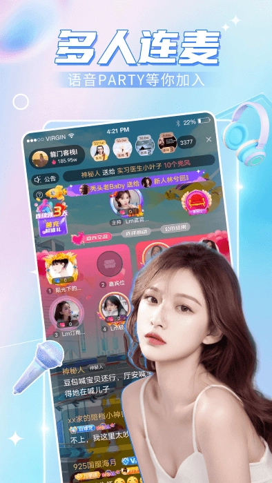 多人在线欢乐互动,群聊房间随时连麦畅聊。