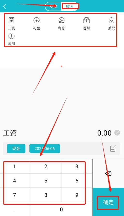 3、记录收入的方法也类似,选好对应的收入类型,填好收入金额,最后点击保存,就能轻松记录收入情况。