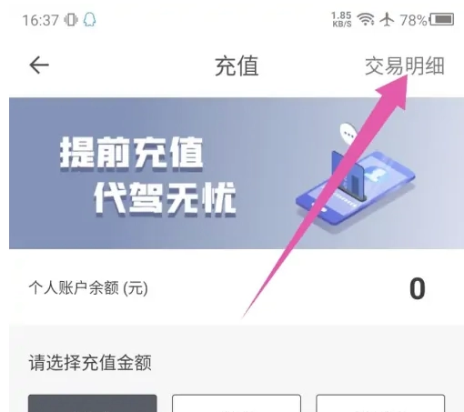 4、在充值页面,点击右上角的交易明细查看。