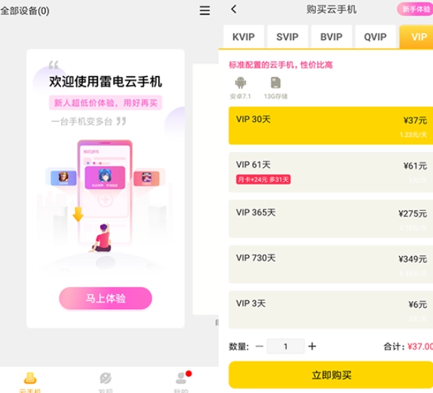2、接着注册并登录账号,然后在云手机里获取设备(当前建议选择Qvip、Svip)